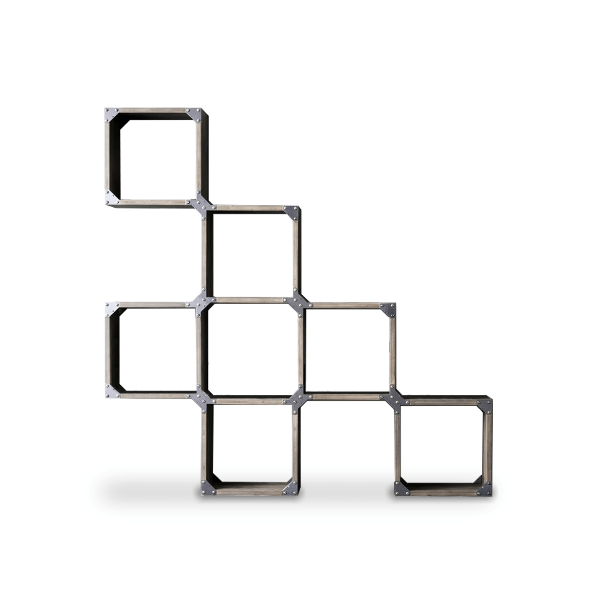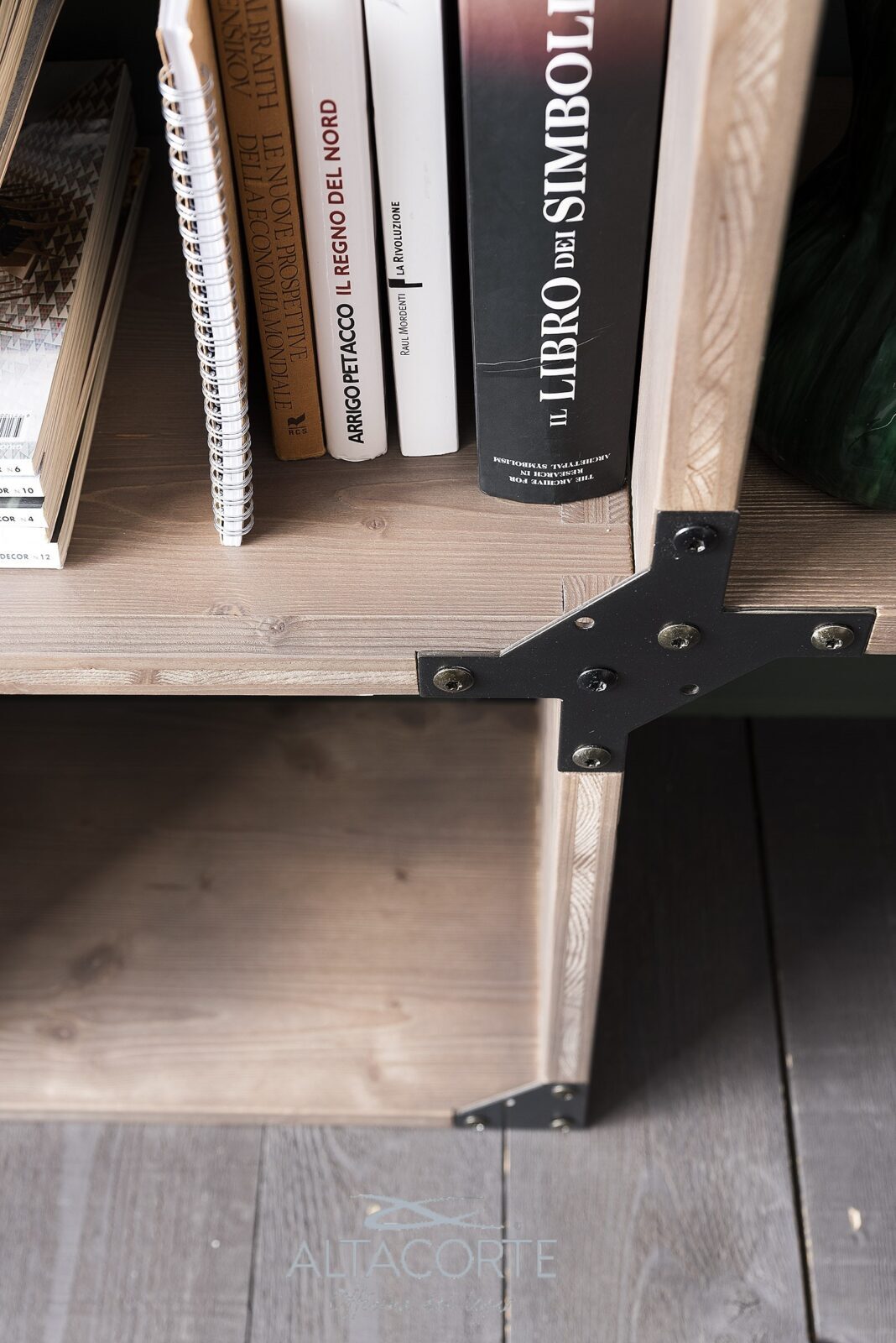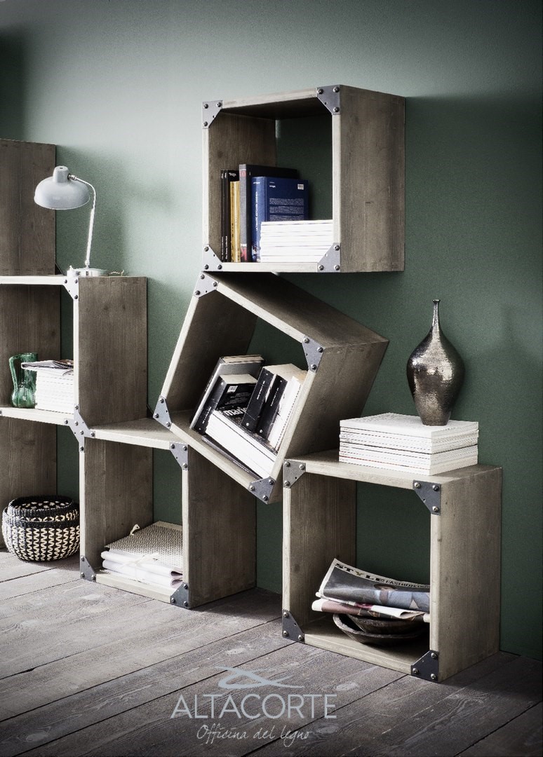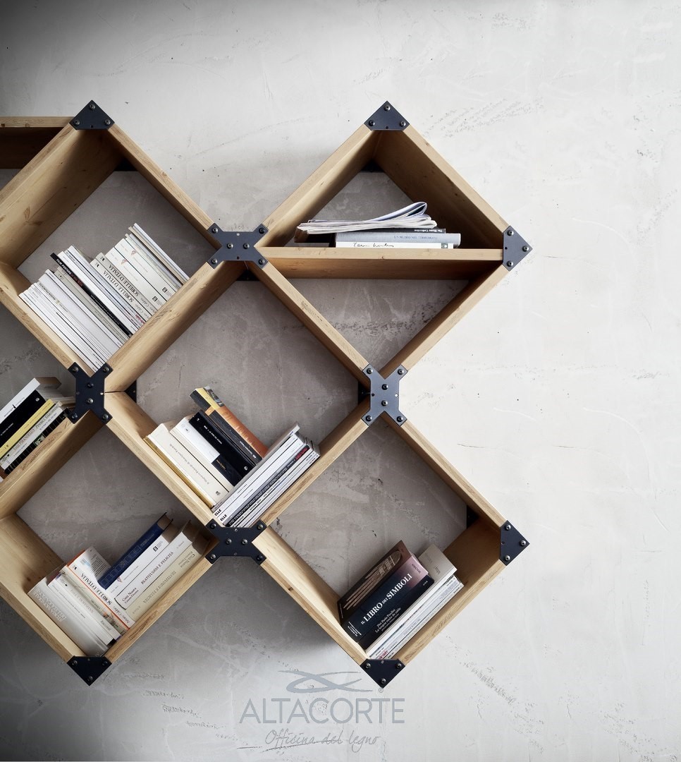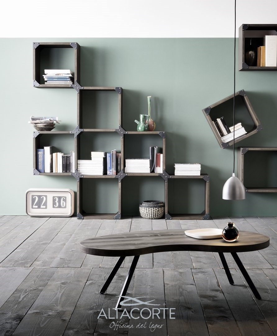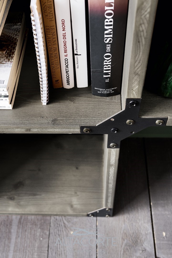 Bibliothèque avec un schéma en chêne massif ou sapin fix. Les chants sont irréguliers et les supports structuraux en fer rappellent le style industrial chic. Vous ne trouvez pas la juste combinaison ? chez nos revendeurs vous pourrez la personnaliser selon vos exigences.