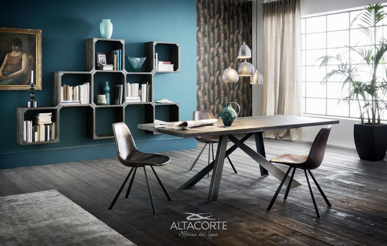 Supports structuraux en fer, étagères en chêne massif d’ép. 40 mm.