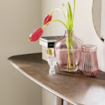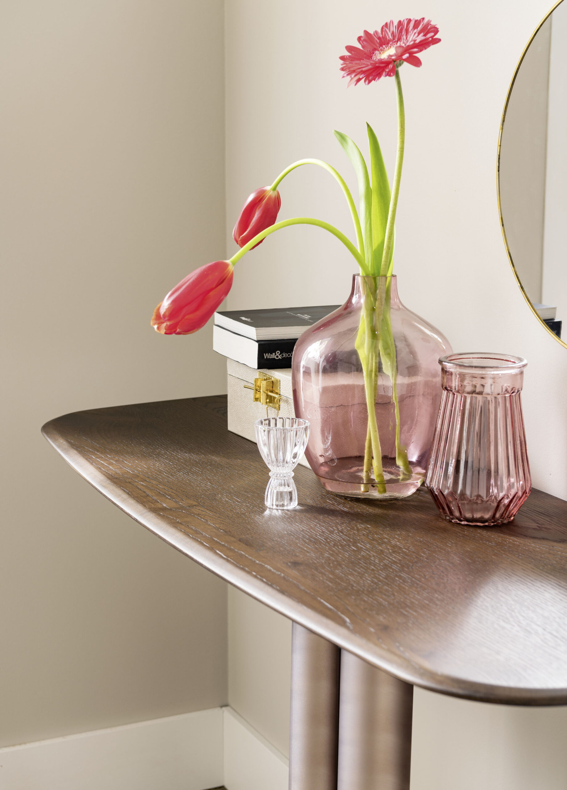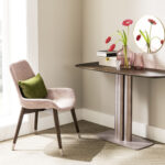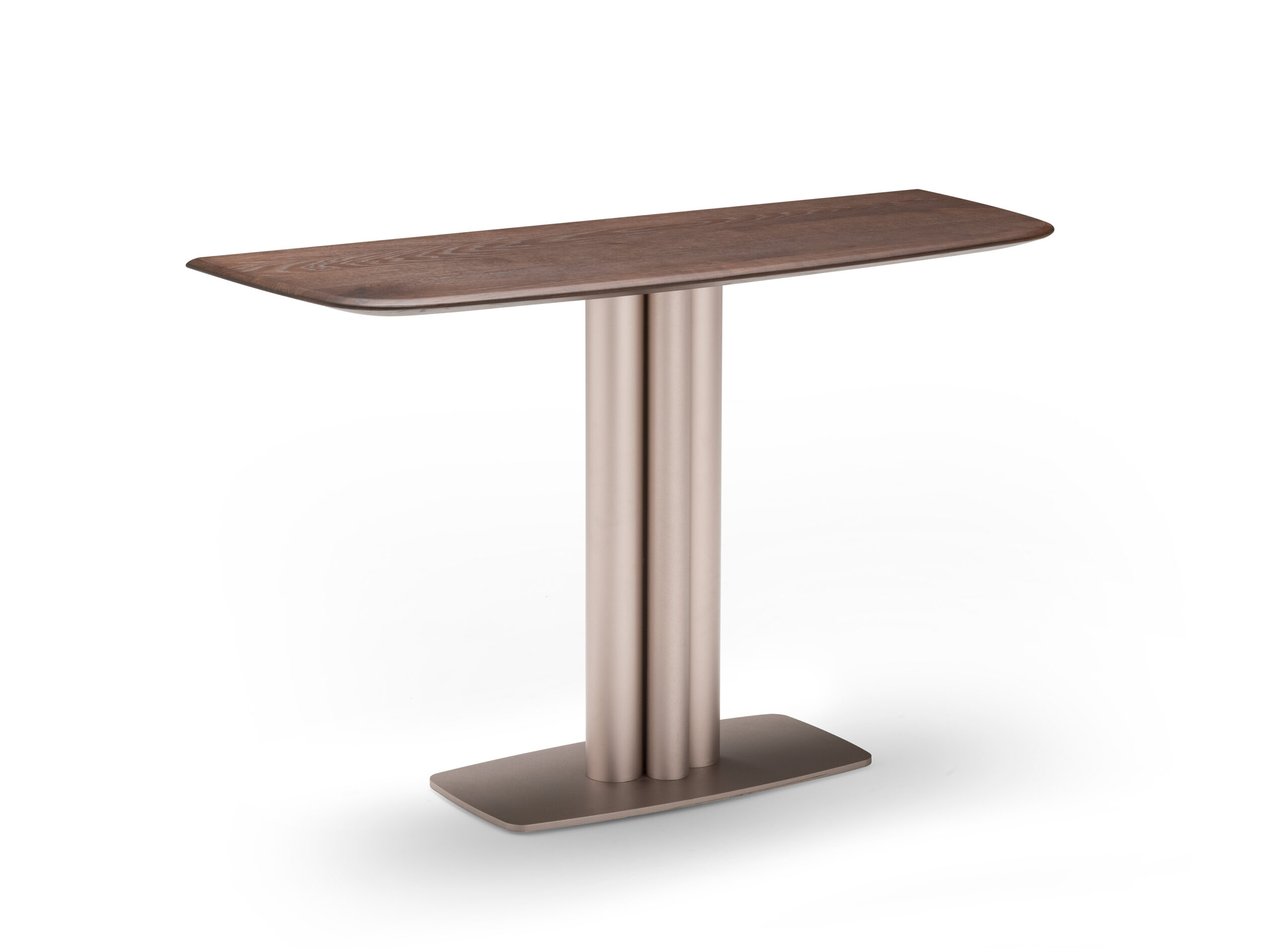 Plateaux en chêne massif de 30 mm d’épaisseur avec surface brossée ou en noyer canaletto massif non brossé. Colles vinyliques à l’eau, peintures acryliques bi-composantes. Base en acier peint à poudre acrylique.