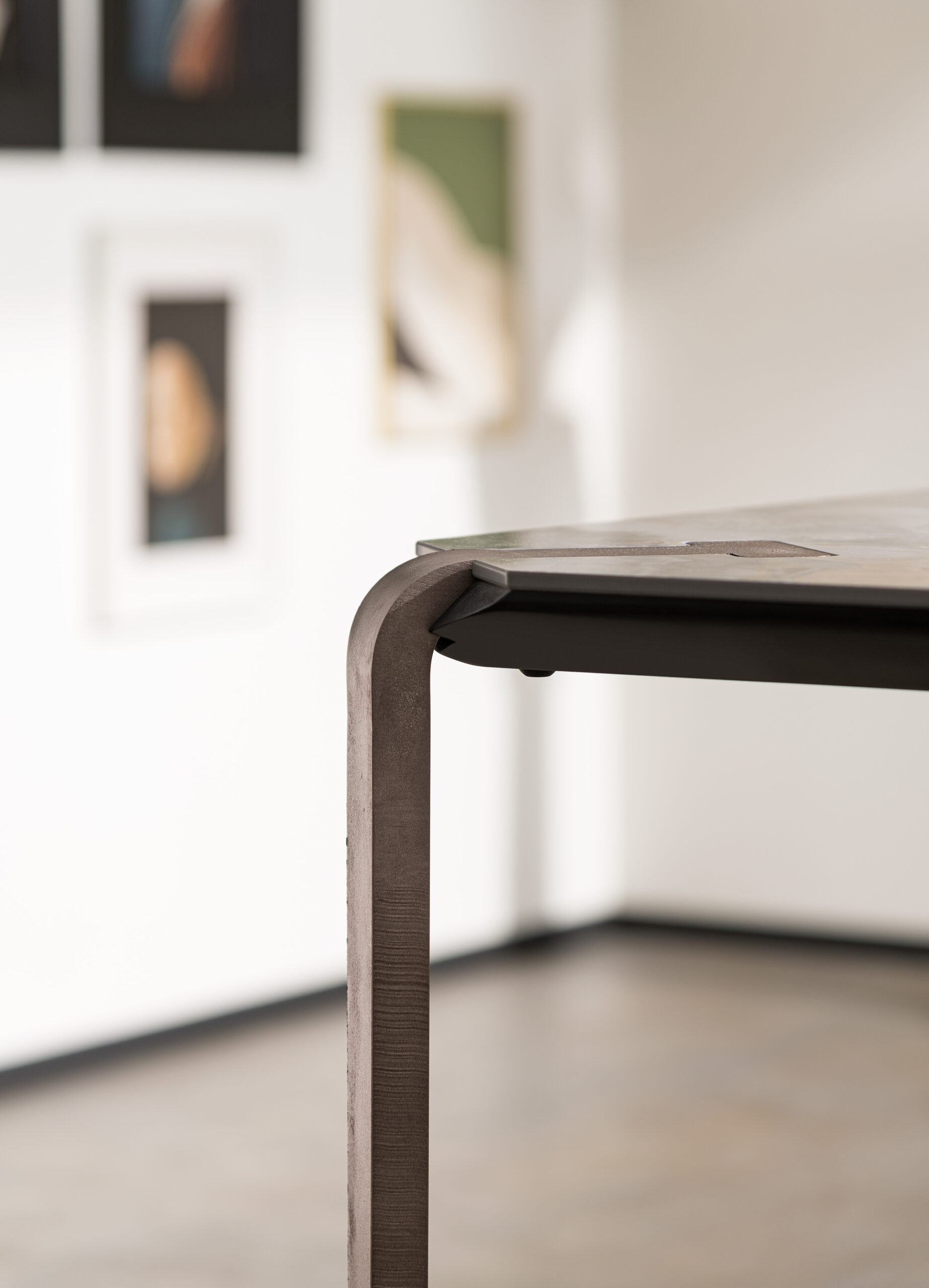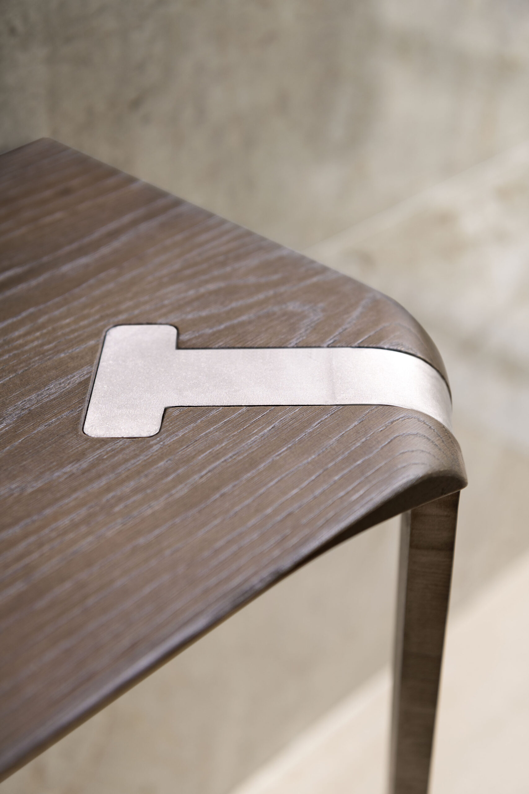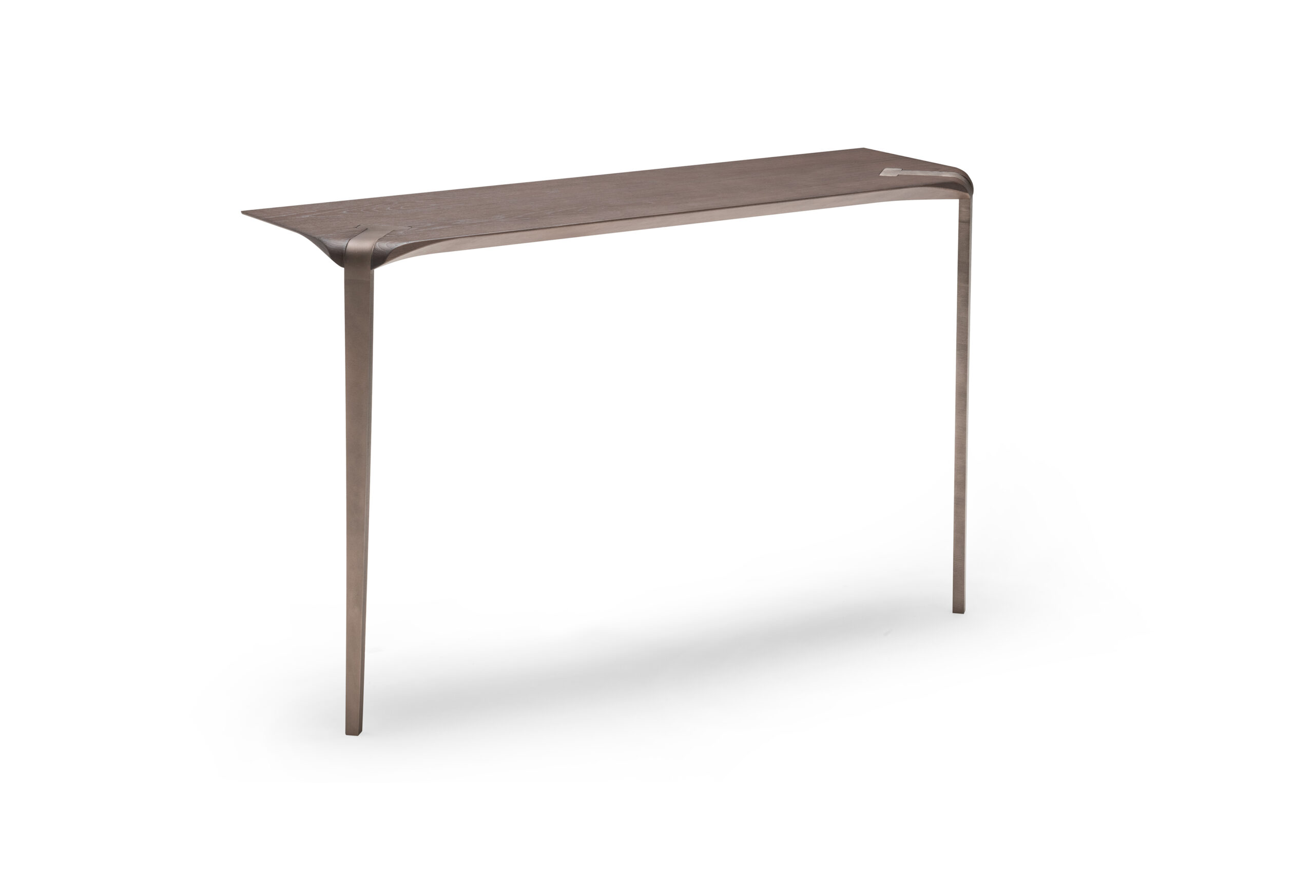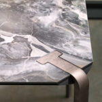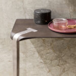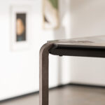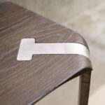 Plateaux en chêne massif de 40 mm d’épaisseur avec surface brossée ou en noyer canaletto massif non brossé ou de 35 mm d’épaisseur avec plateau en céramique et support en MDF. Colles vinyliques à l’eau, peintures acryliques bi-composantes. Base en acier peint à poudre acrylique.