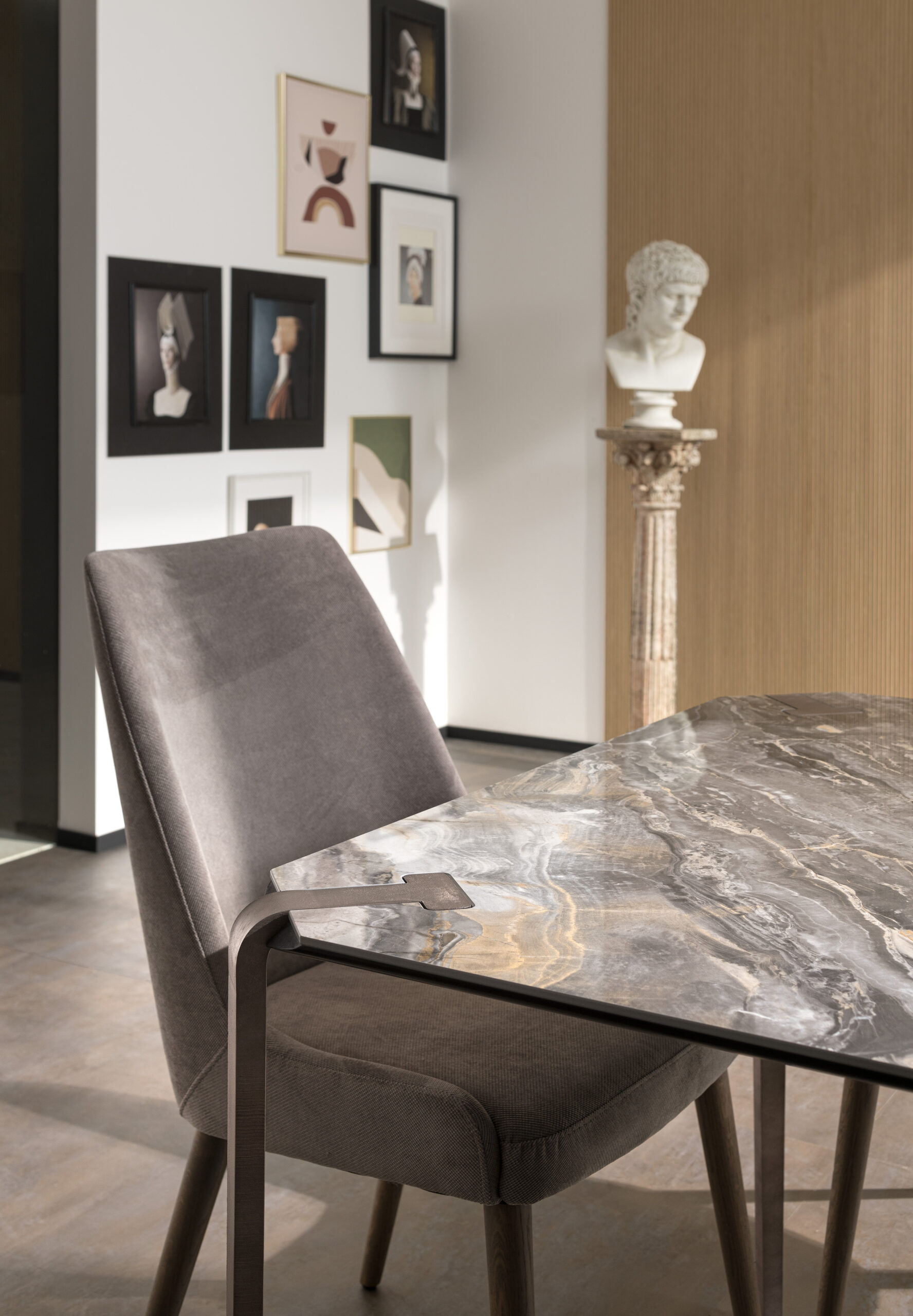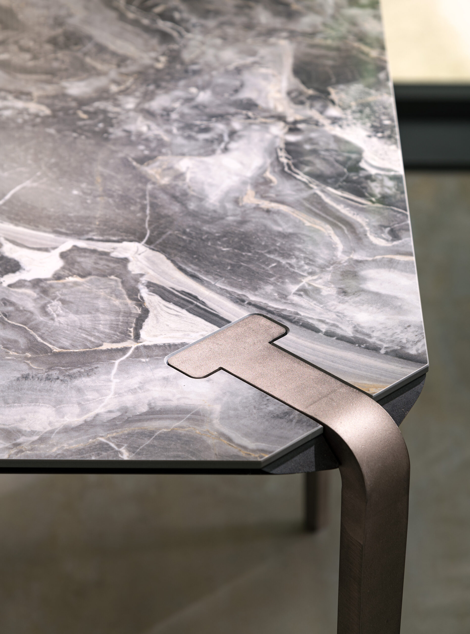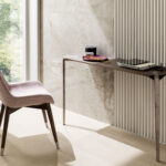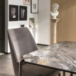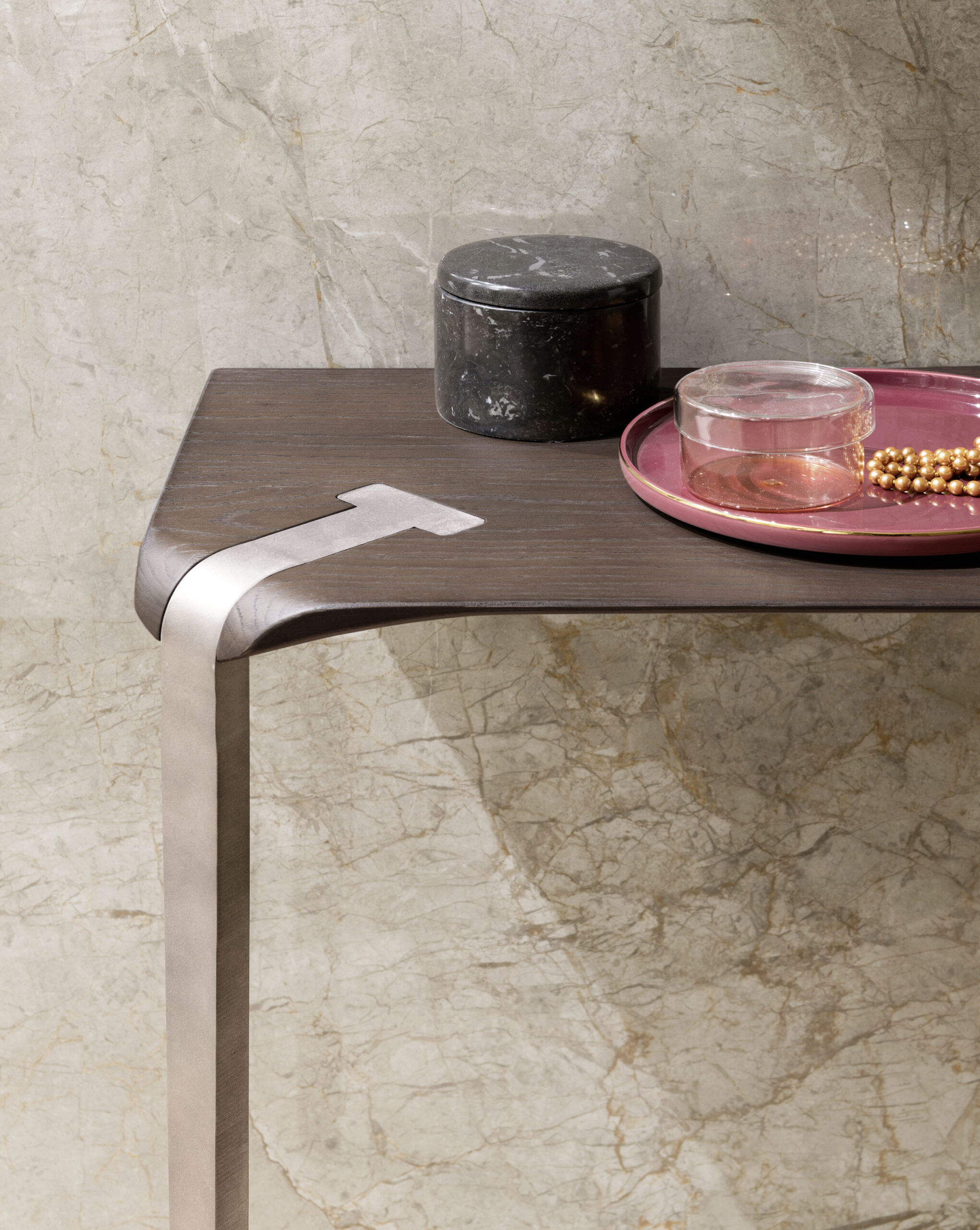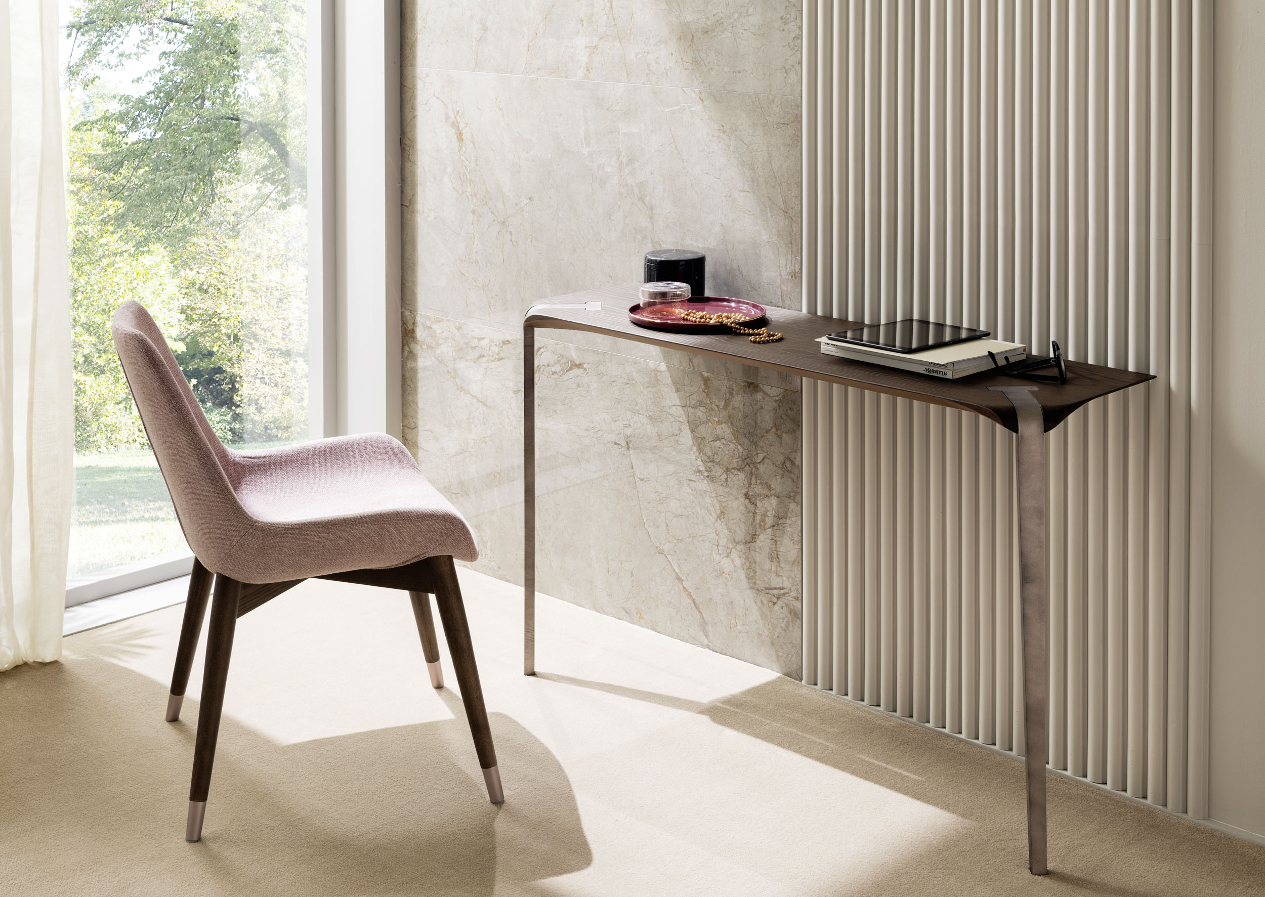Plateaux en chêne massif de 40 mm d’épaisseur avec surface brossée ou en noyer canaletto massif non brossé ou de 35 mm d’épaisseur avec plateau en céramique et support en MDF. Colles vinyliques à l’eau, peintures acryliques bi-composantes. Base en acier peint à poudre acrylique.