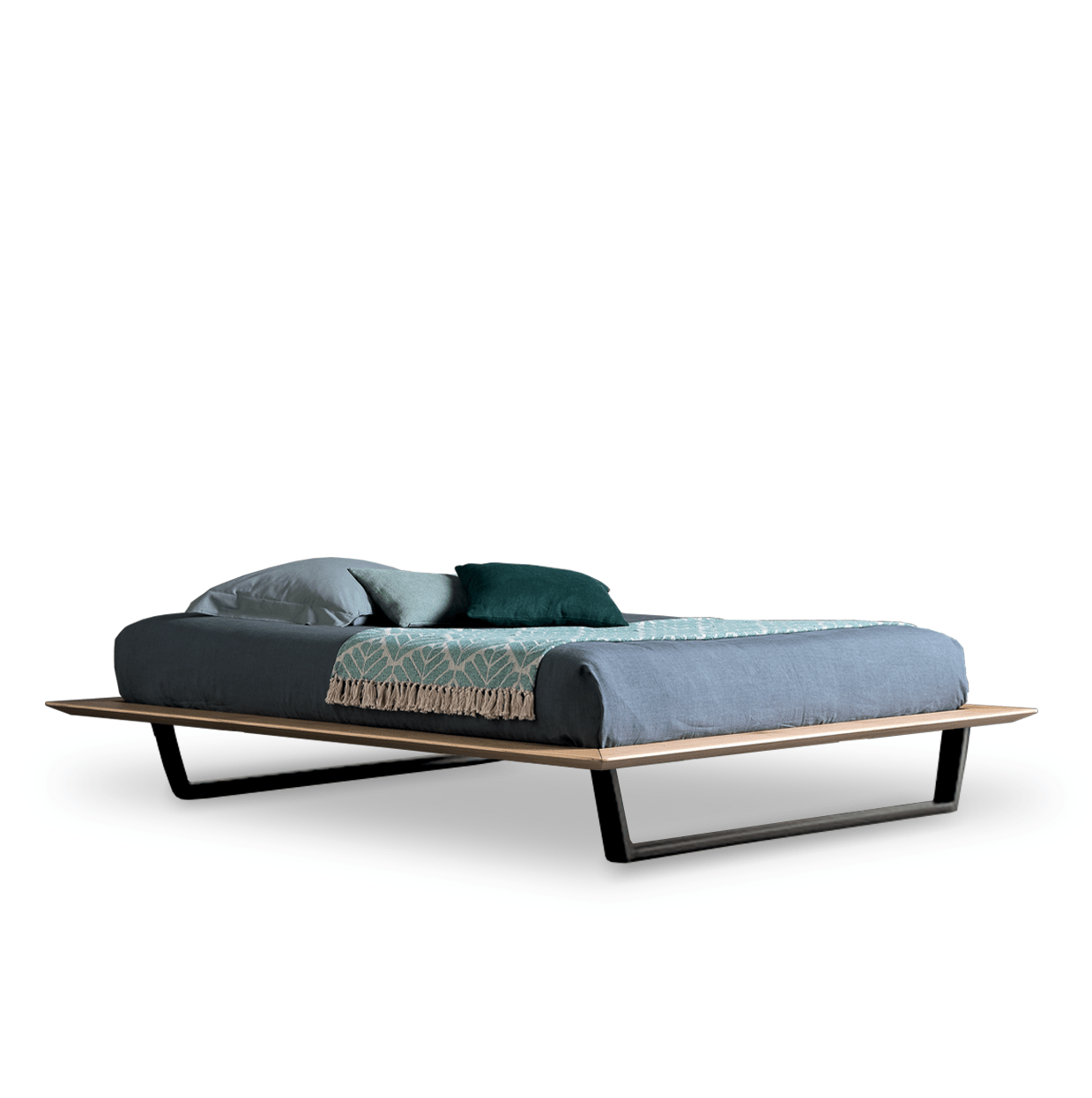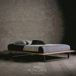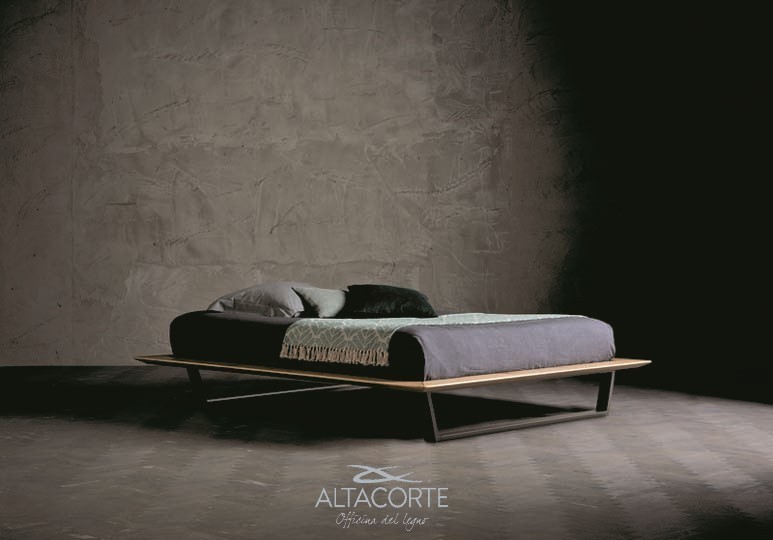 Lit avec cadre en chêne européen massif sur lequel est fixé la structure du sommier. Le cadre de la structure est en métal et les lattes en bois de bouleau. Il est disponible avec trois types de pieds en fer différents : polyèdre, trapèze et «V».