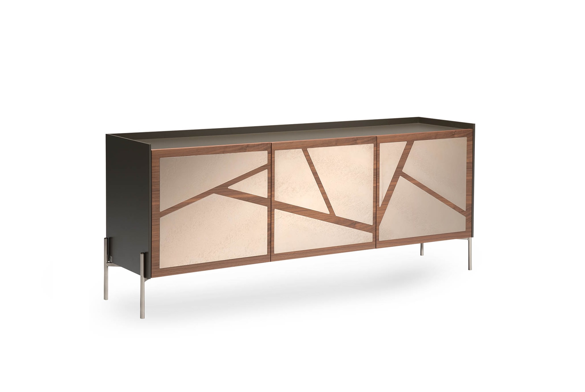 Scocca disponibile in due versioni: materico o legno di rovere. Le ante sono in rovere. Basamenti in acciaio verniciato a polveri o ossidato con finitura acrilica. In alternativa plexiglass trasparente extra chiaro spessore 15 mm.