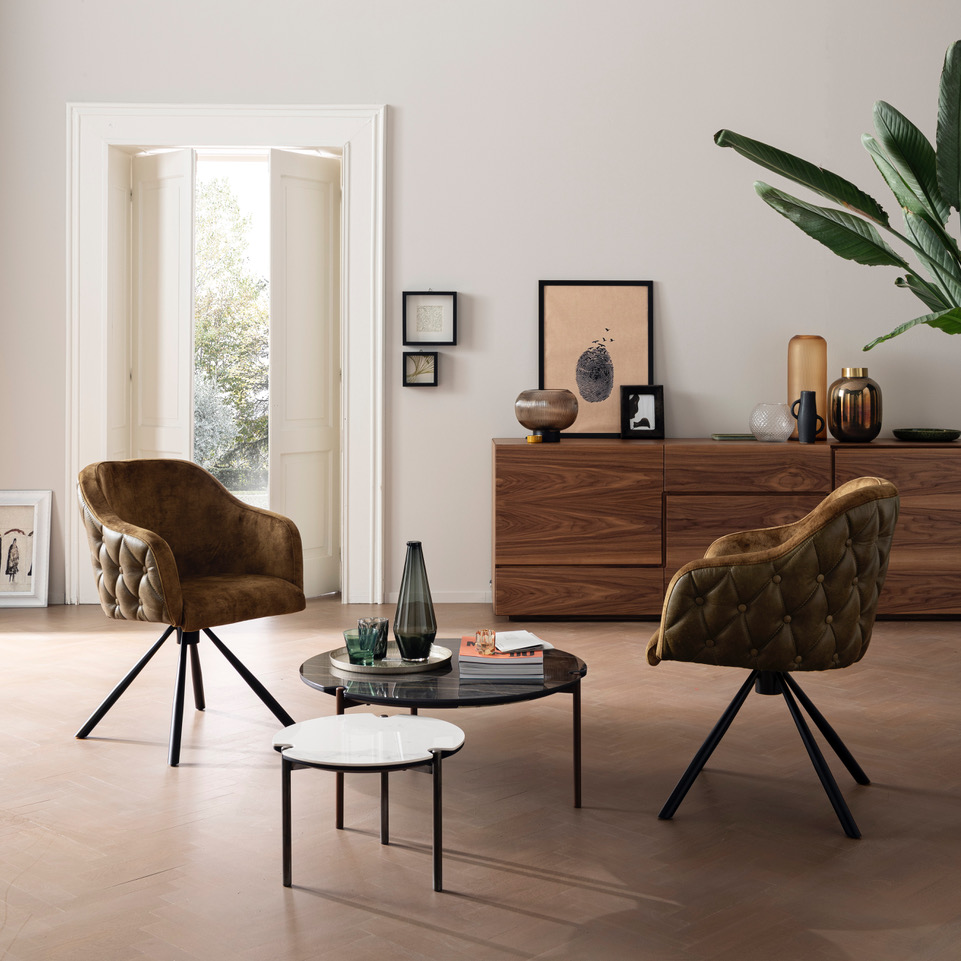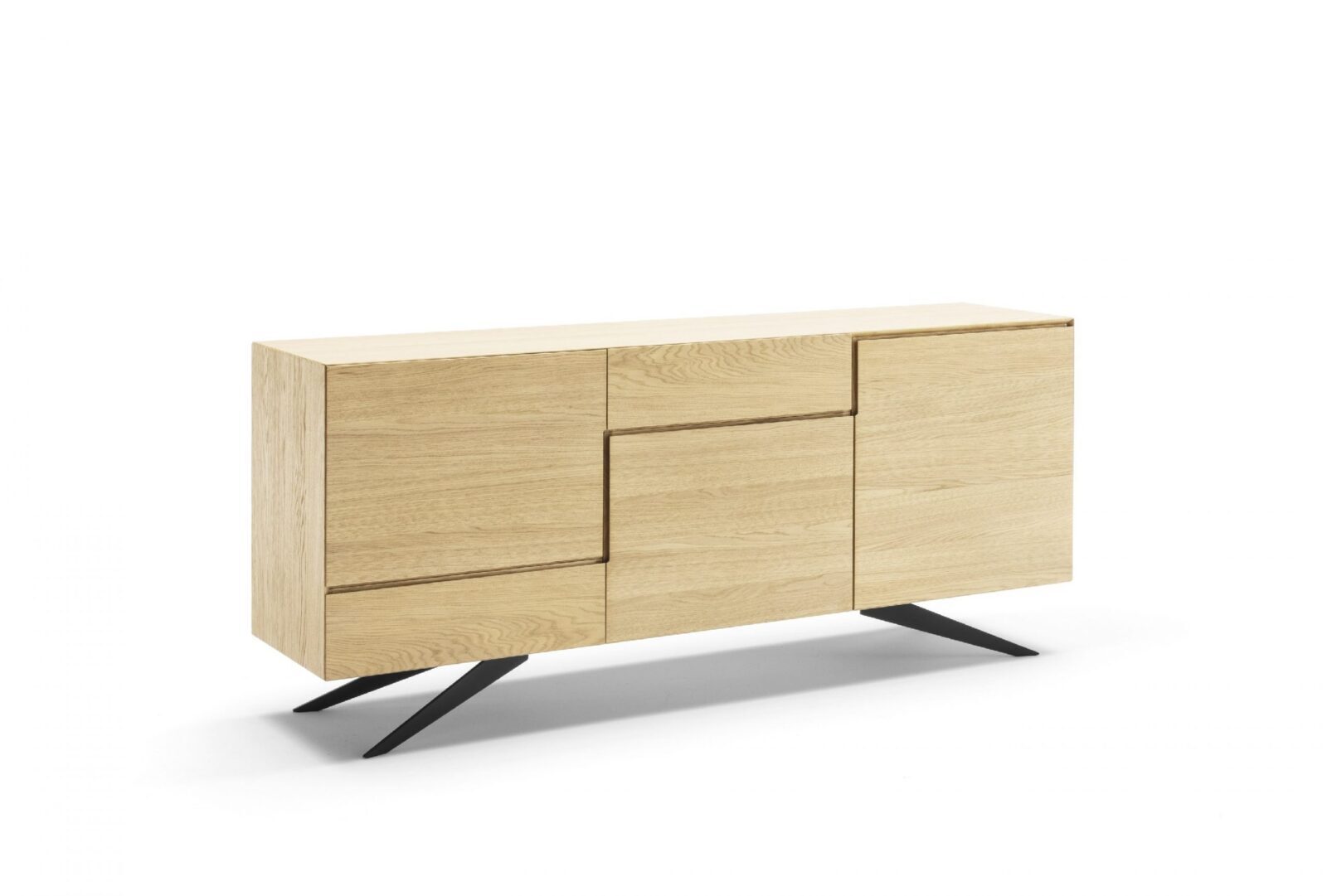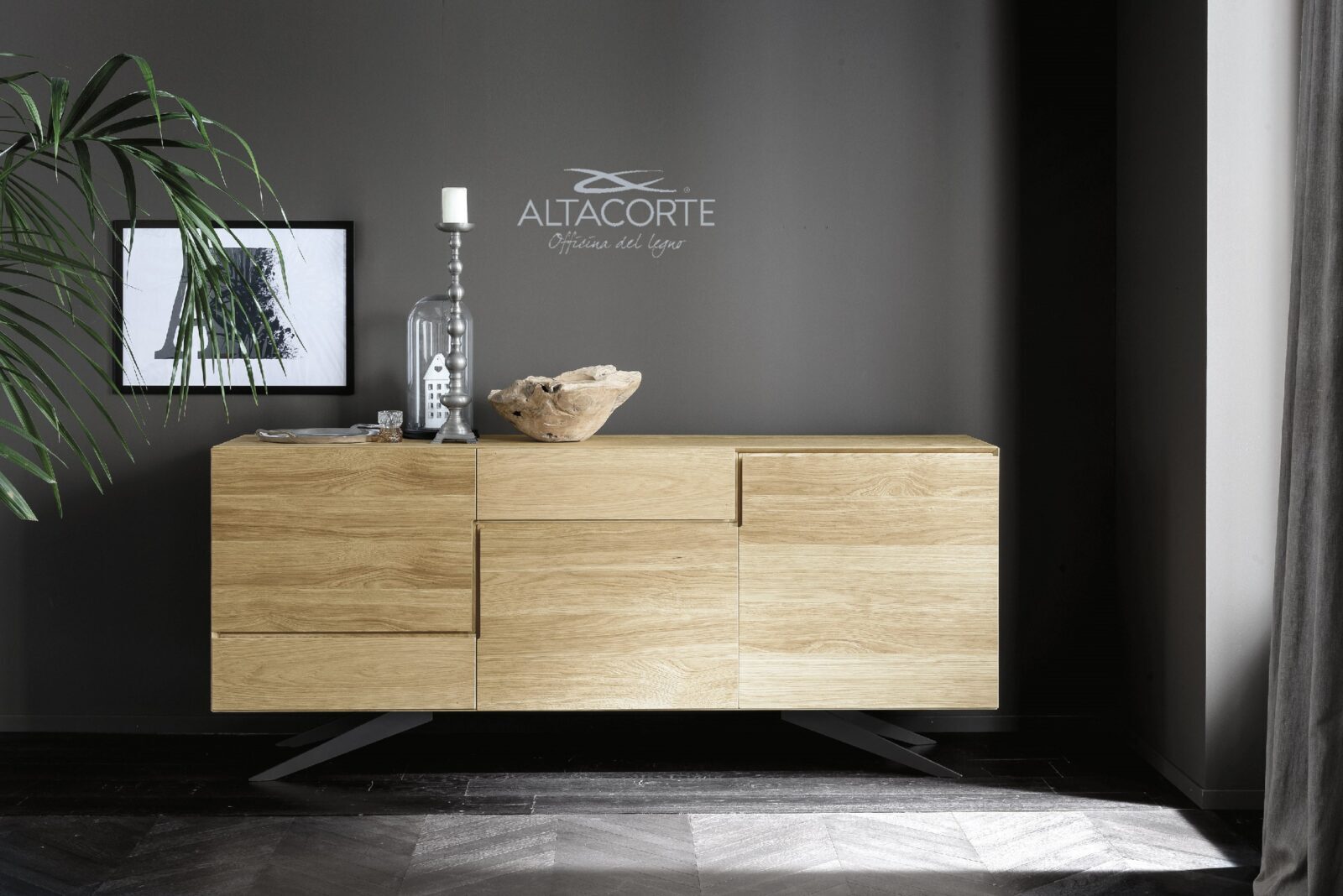 bahut 3 portes et 2 tiroirs réalisé entièrement en chêne. Surface extérieure brossée. Joue brossée. Colles vinyliques et résines uréiques à l’eau conforme aux normes UNI-CEE. Piètement en acier laqué époxy ou oxydé avec une finition acrylique