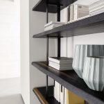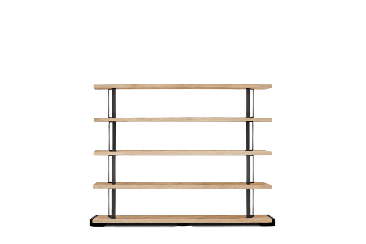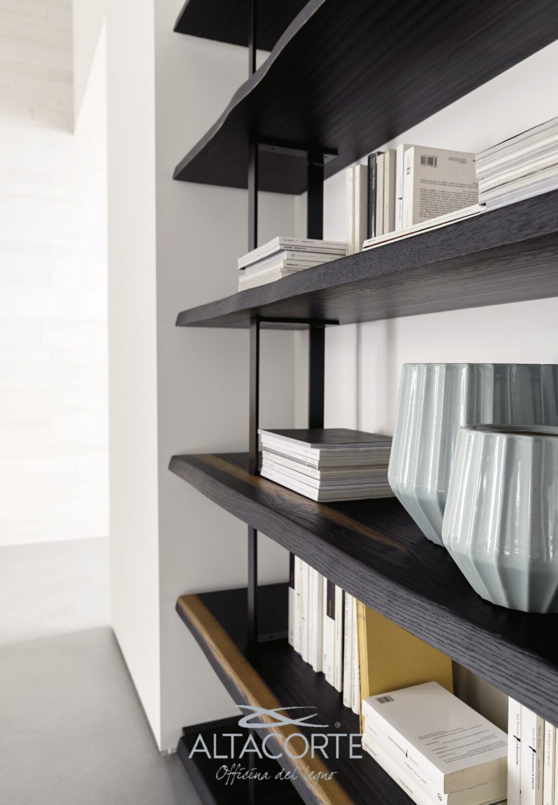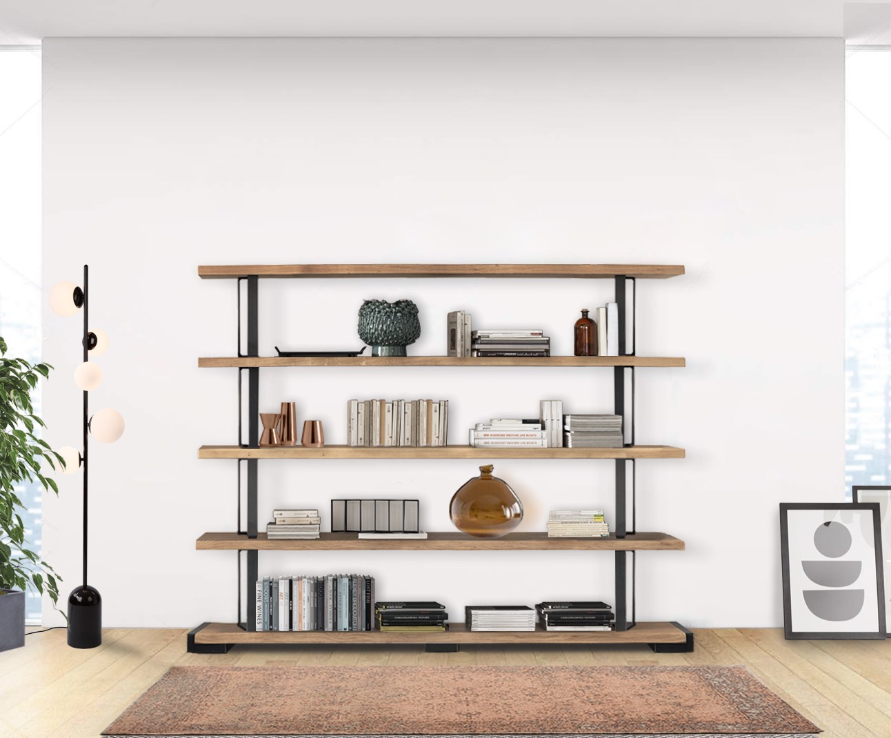 Bibliothèque en chêne massif avec un schéma fix. Les chants sont irréguliers et les supports structuraux en fer rappellent le style industrial chic. Vous ne trouvez pas la juste combinaison ? chez nos revendeurs vous pourrez la personnaliser selon vos exigences.