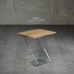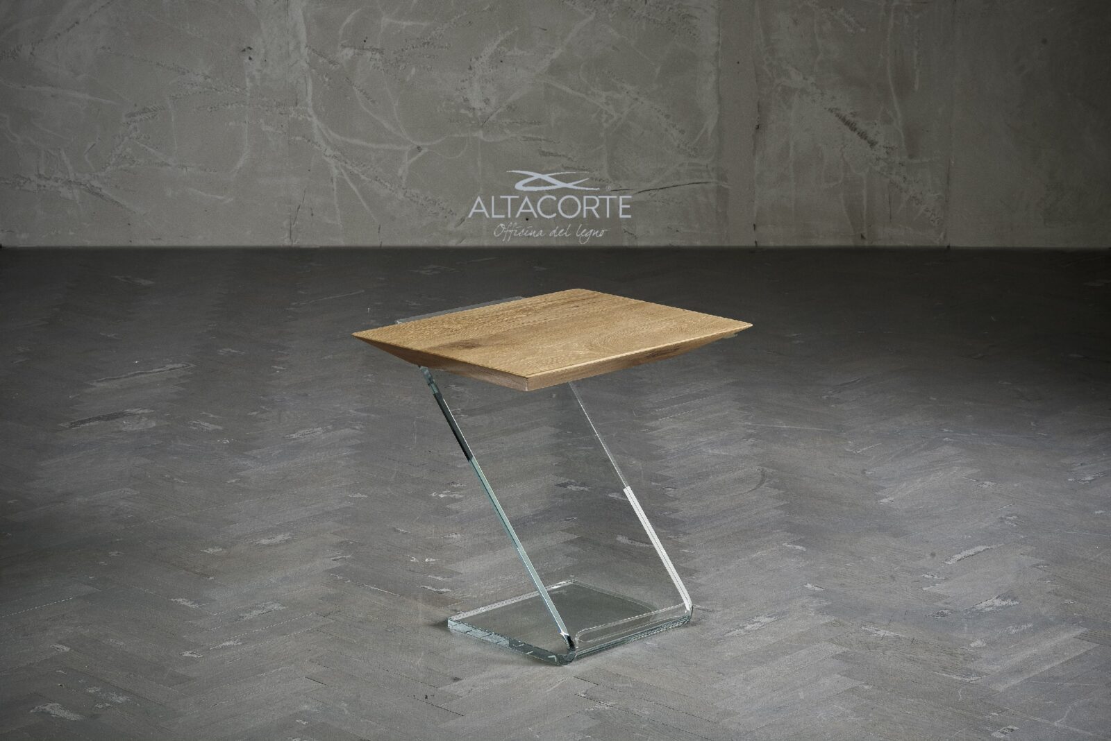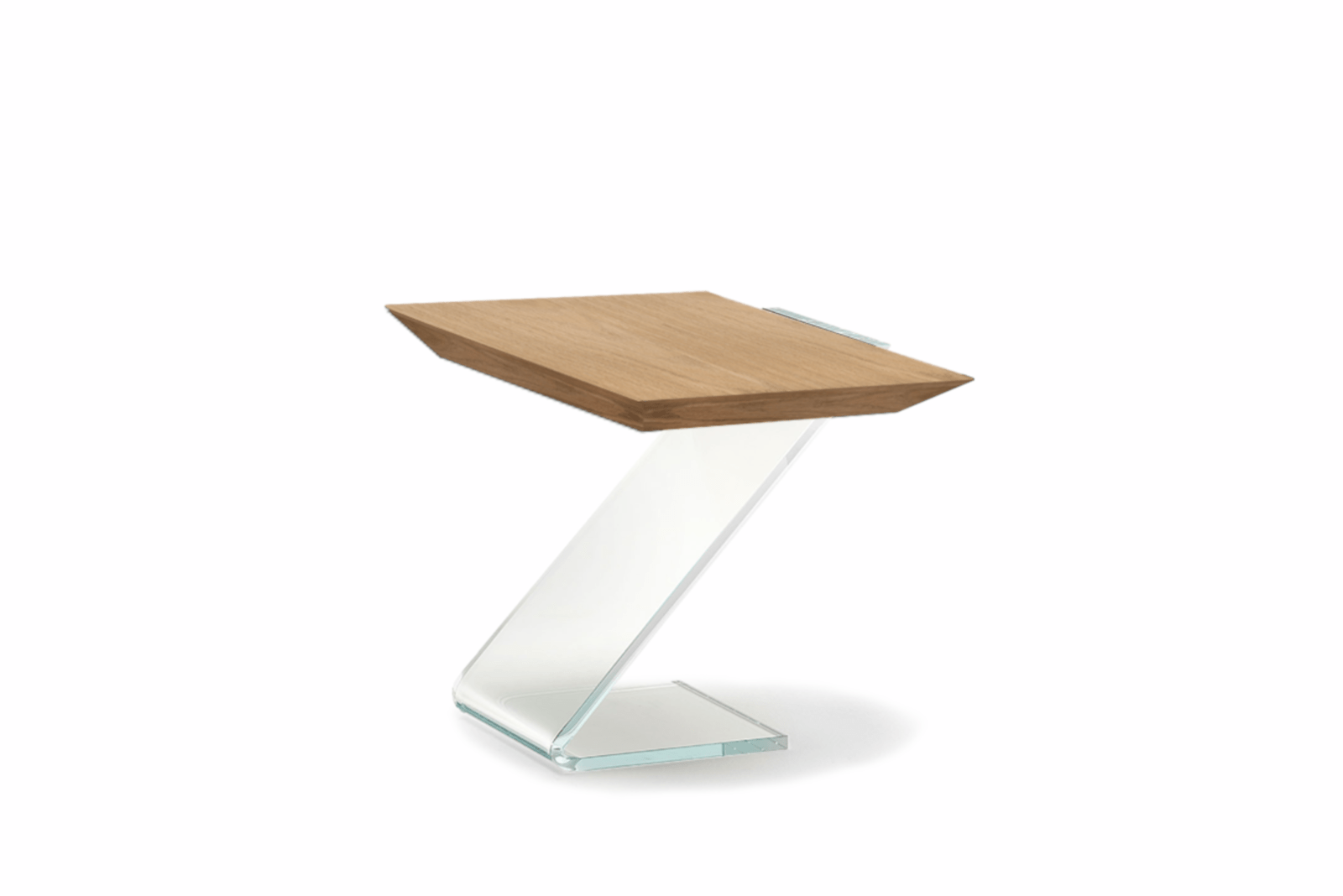 Plateau en chêne massif ép .60 ou enrobé d’un placage d’ép. 60 mm. Piètement en verre ép. 19 extra light courbé à chaud. Non trempé. Colles vinyliques à base d’eau, peintures acryliques bi-composantes.
