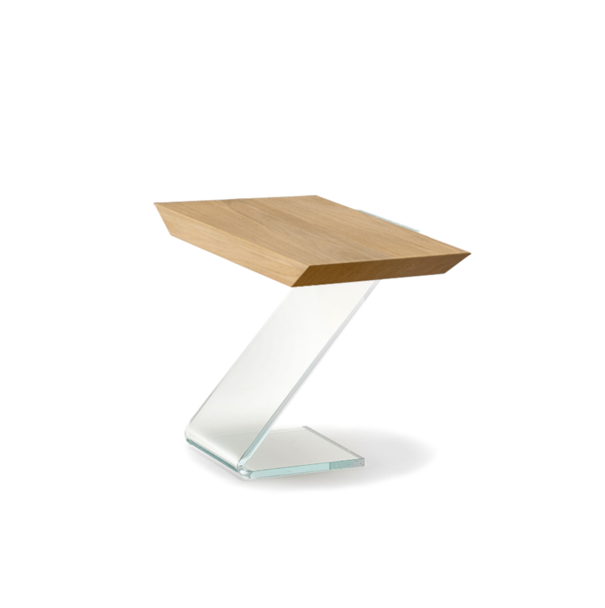 Plateau en chêne massif ép .60. Piètement en verre ép. 19 extra light courbé à chaud. Non trempé. Colles vinyliques à base d’eau, peintures acryliques bi-composantes.