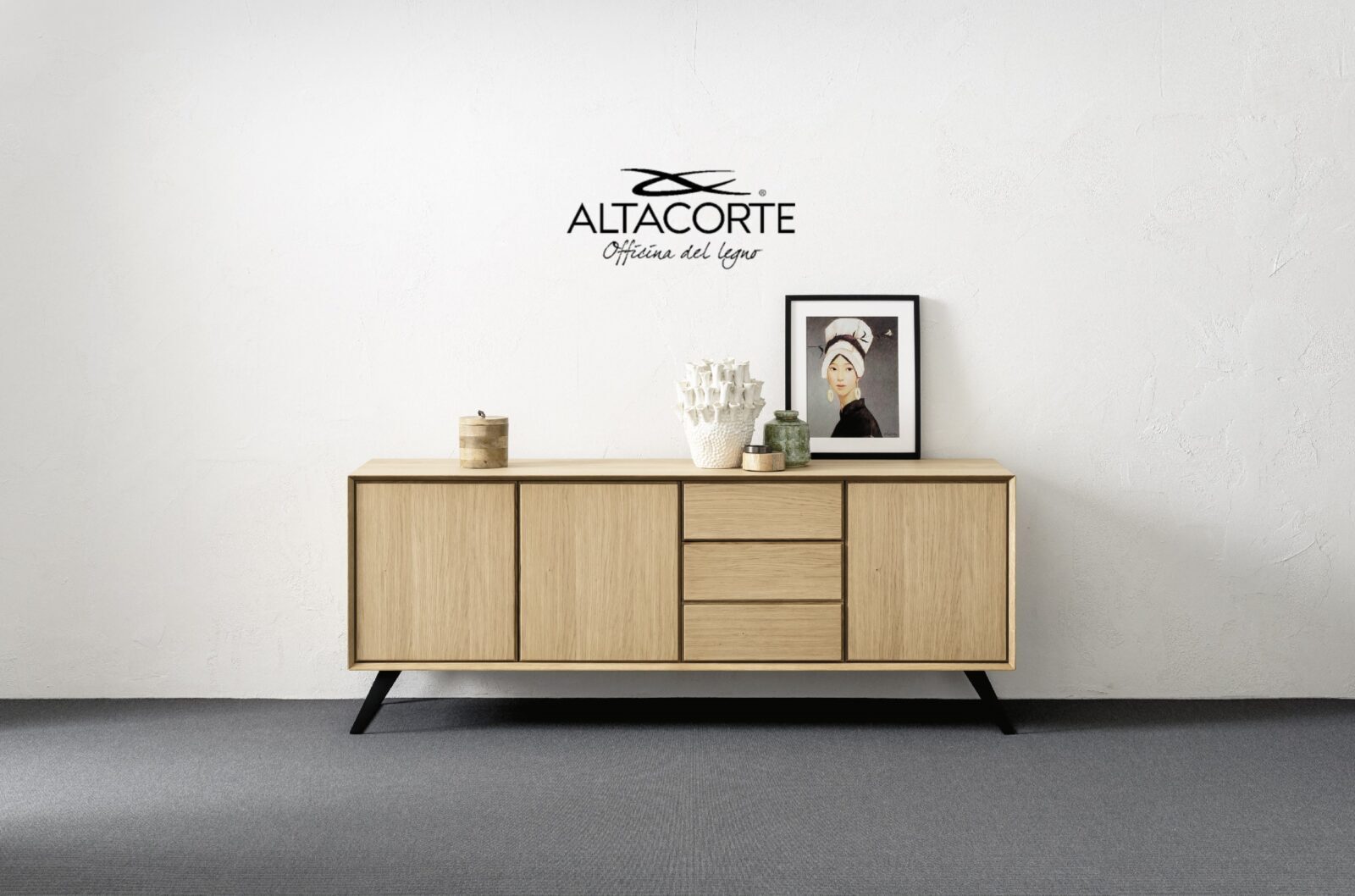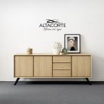 Un classique du style Altacorte. Bahut avec caisson entièrement en chêne ou en noyer, créé par les mains d’artisans experts. Une ligne essentielle mais jamais banale qui peut encore être mise en valeur par des portes en ciment