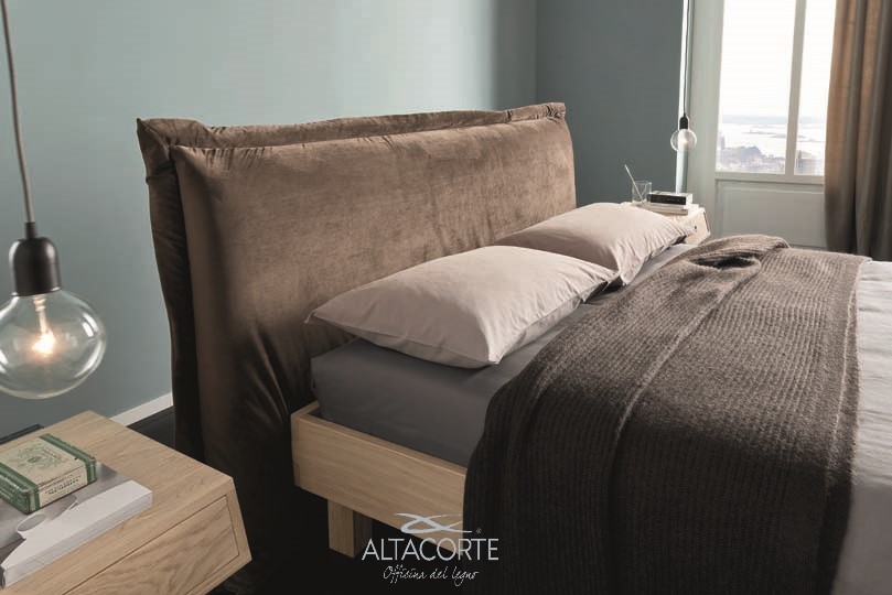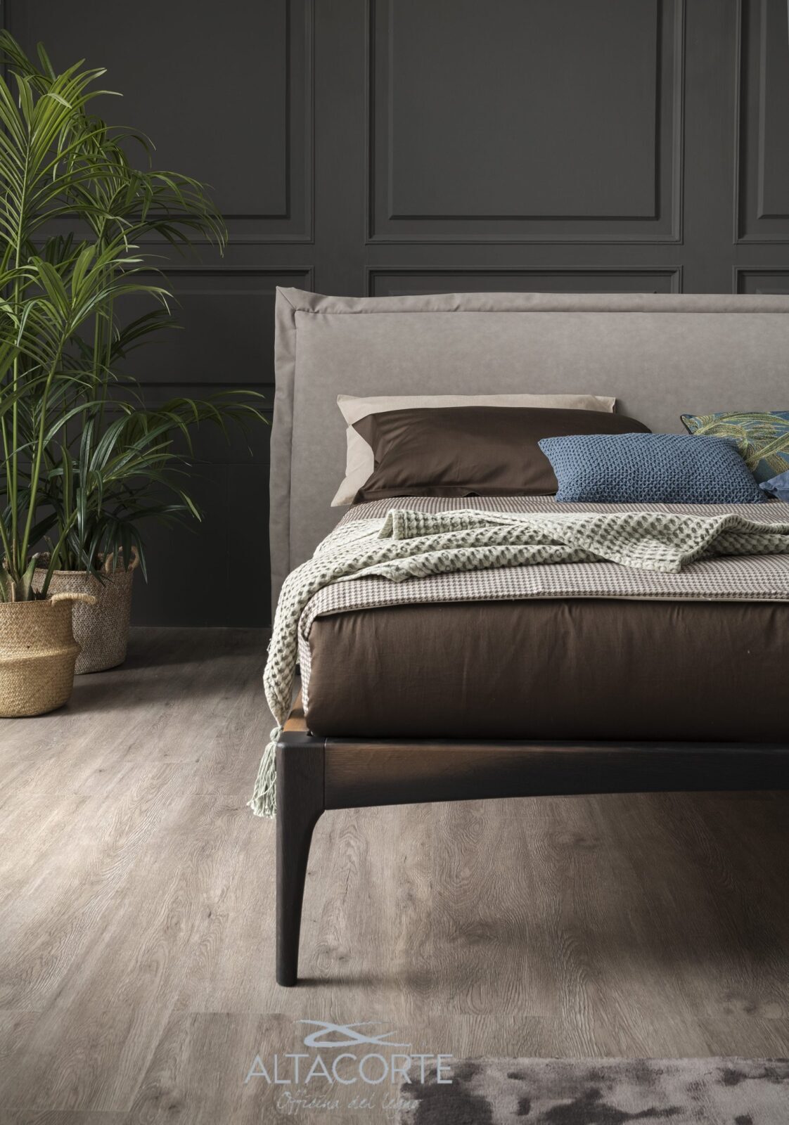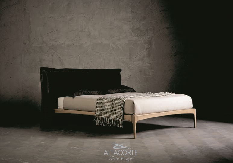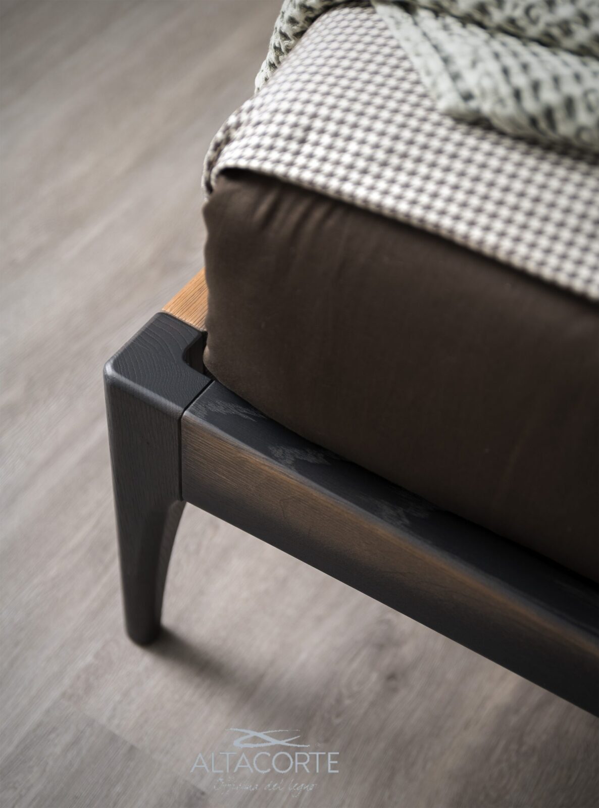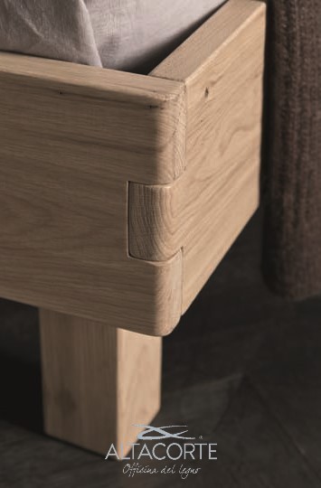 Lit avec cadre en chêne européen massif. La tête de lit en bois est constituée par de planches en bois de chêne européen massif. La tête de lit rembourrée a un noyau interne en multiplis de hêtre, revêtu en tissu, cuir ou éco-cuir déhoussables. La tête de lit peut être combinée avec huit configurations de lit différentes.