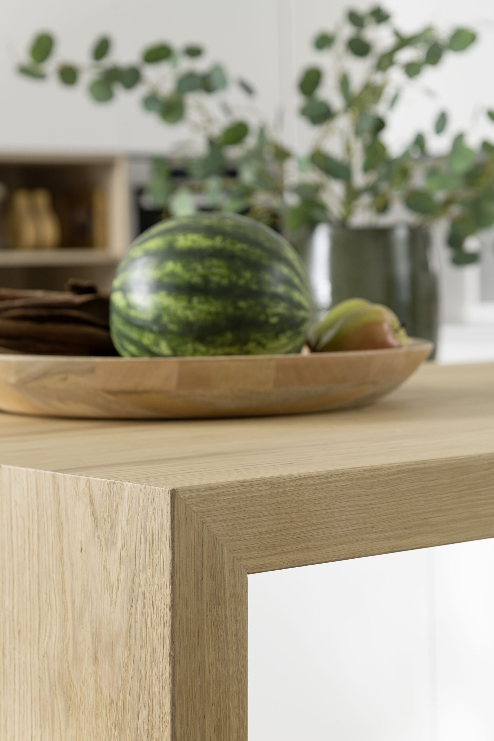Plans ép. 64 mm sur support en lamellé-collé ou en multiplis avec placage sur les deux faces et sur le pourtour en chêne. Surface brossée. La conformation naturelle du tronc est maintenue, y compris les changements de couleur naturels du produit. Colles vinyliques à base d’eau, peintures acryliques bi-composantes.