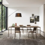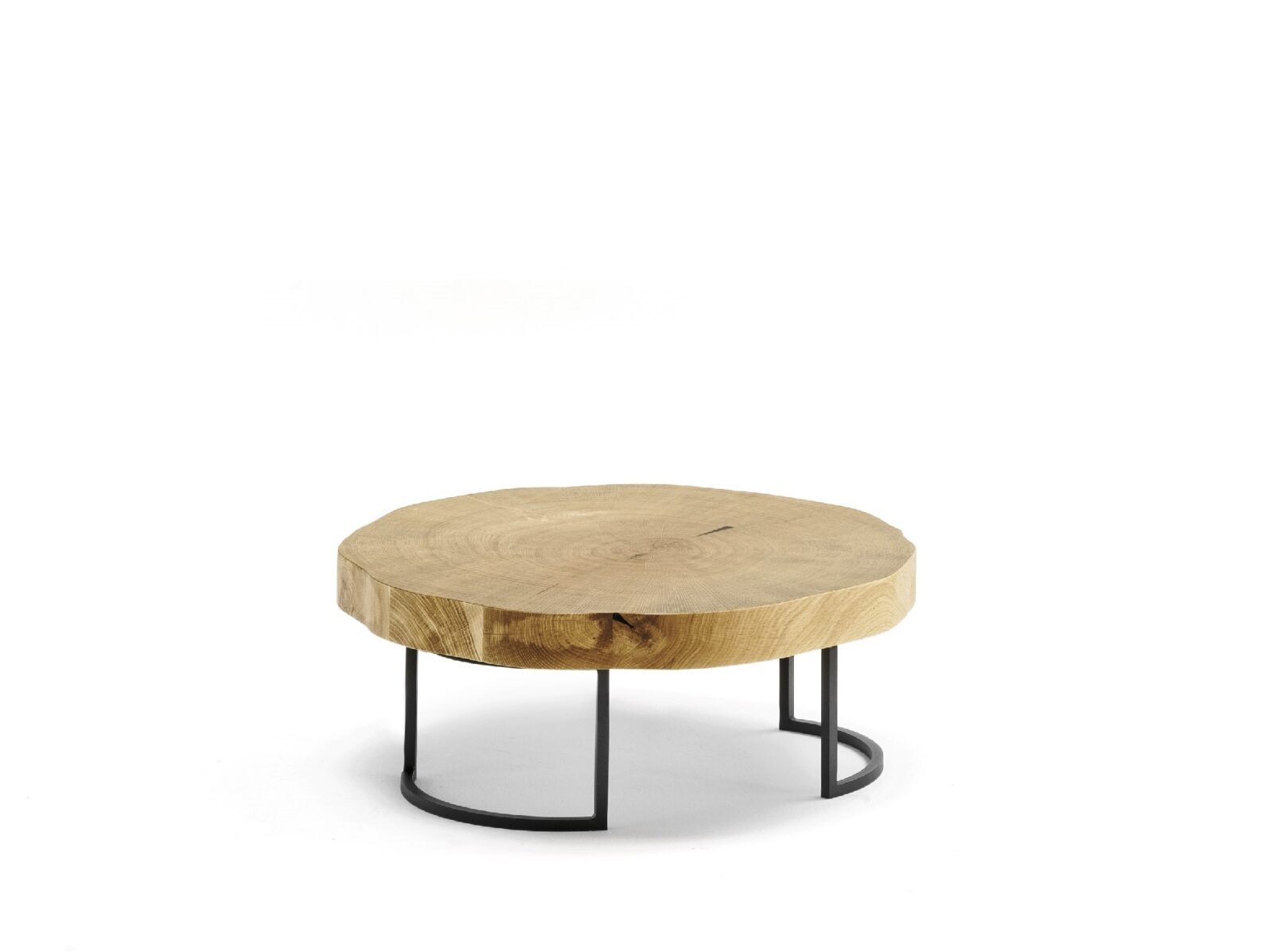 Plateau en chêne massif ép. 60 enrobé d’un placage épais. Piètement en acier laqué époxy.